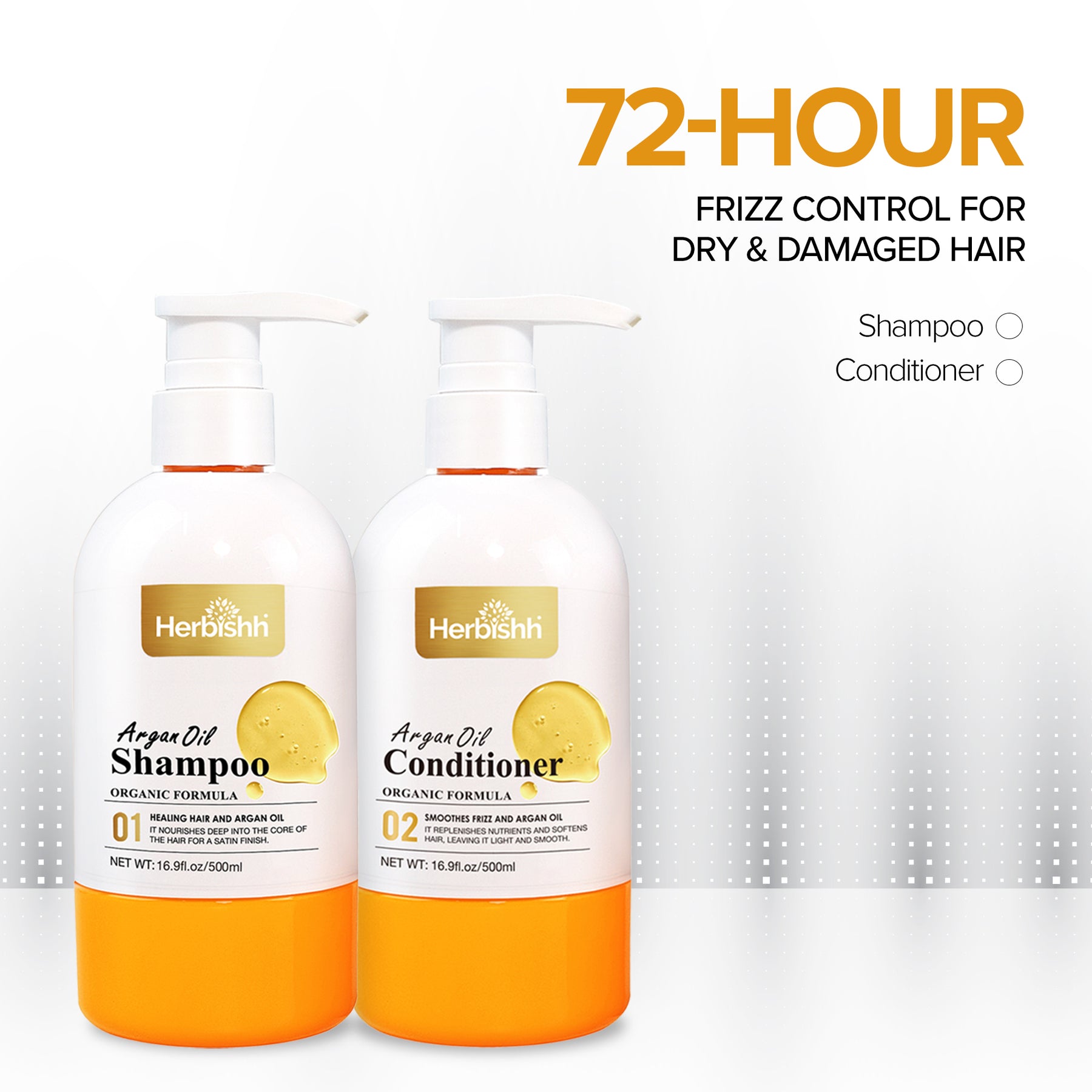 I’m the Herbishh Argan Oil Shampoo and Conditioner, your daily duo infused with Moroccan Argan magic. I add deep hydration to your dry, damaged, or frizzy hair.
