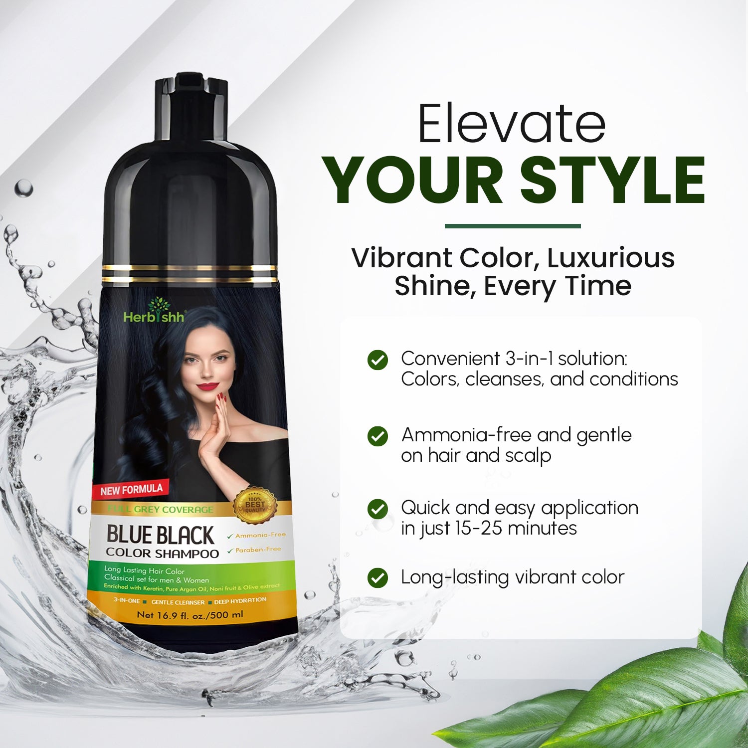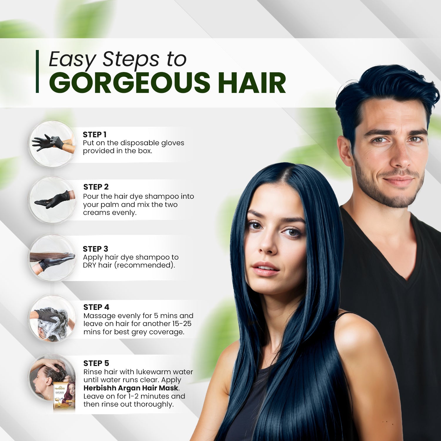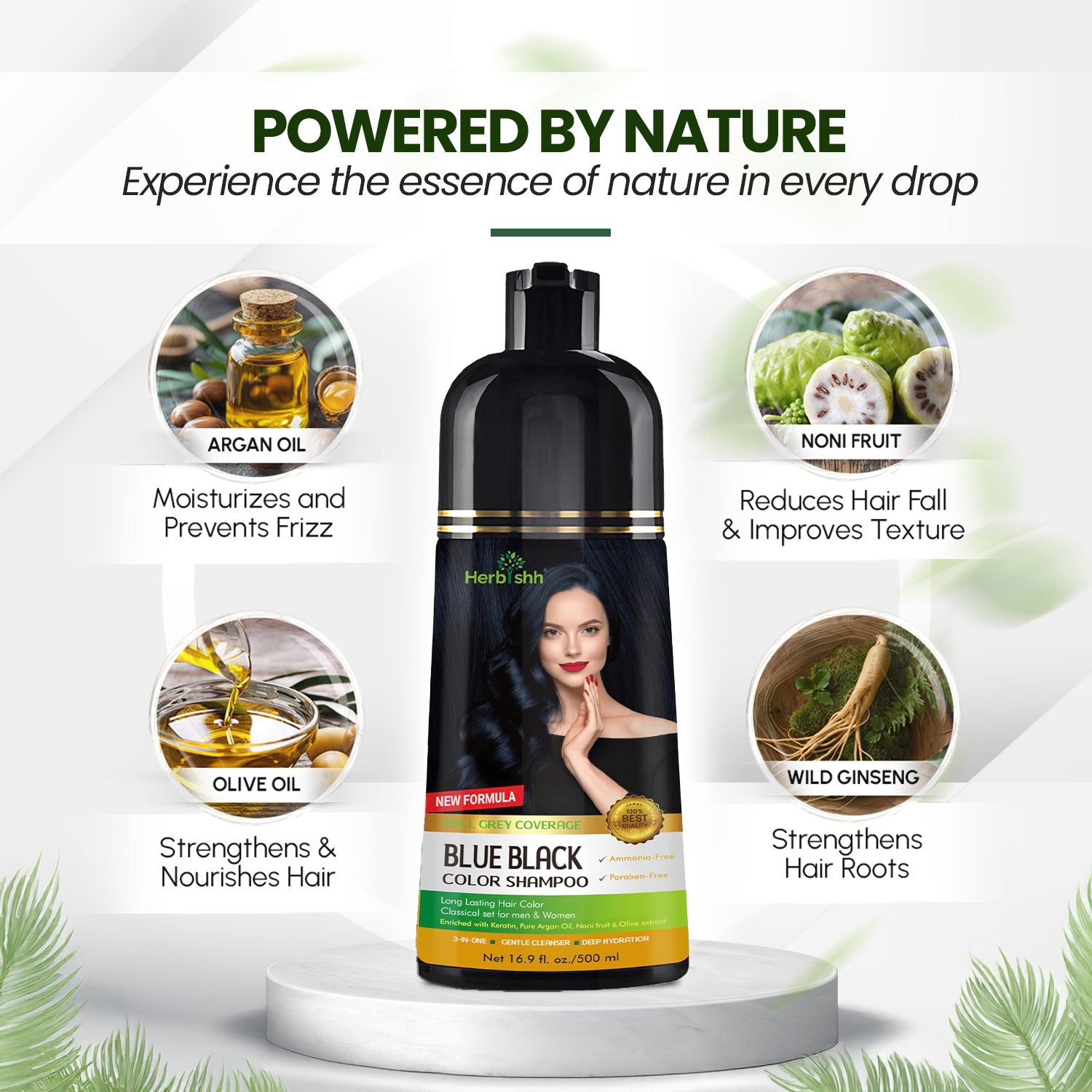 But Bold color shouldn’t come at the cost of your comfort. This is why we are here. The Herbishh hair color shampoo in natural blue black hair shade is created to give you richness, shine, and a shade that will give you main character energy.
