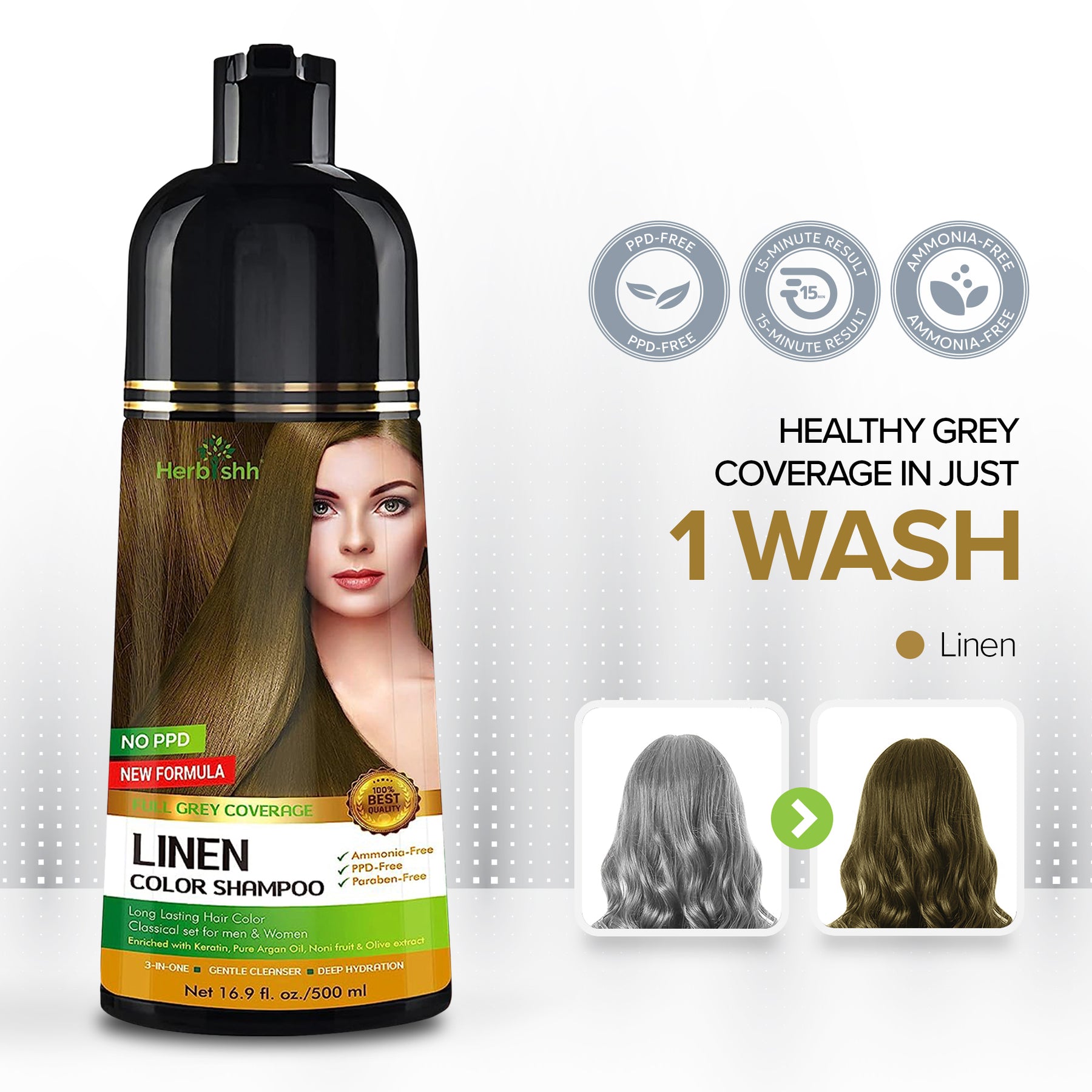 I am a PPD-free hair Dye shampoo that brings out the best in your natural shade. I am Herbish linen color hair shampoo that gives you a soft tone without the bleach or PPD.